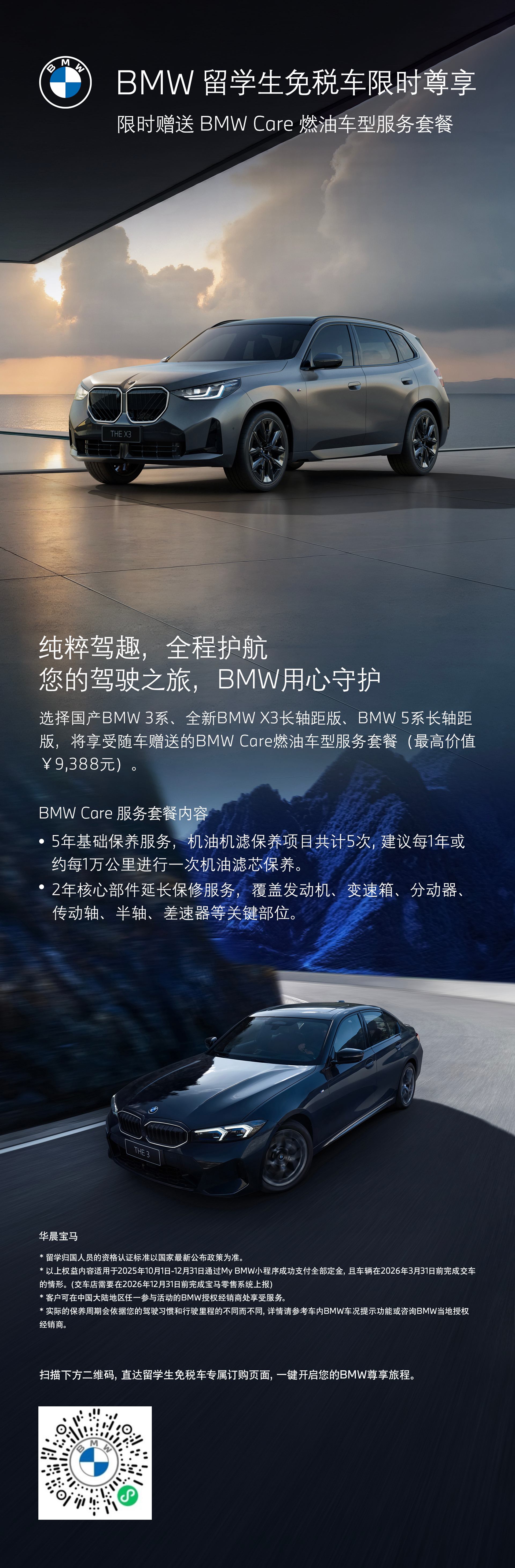 购买国产新BMW X3长轴距版车型(仅油车)可享受随车赠送的BMWCare免费服务套餐(参考价值9388元)