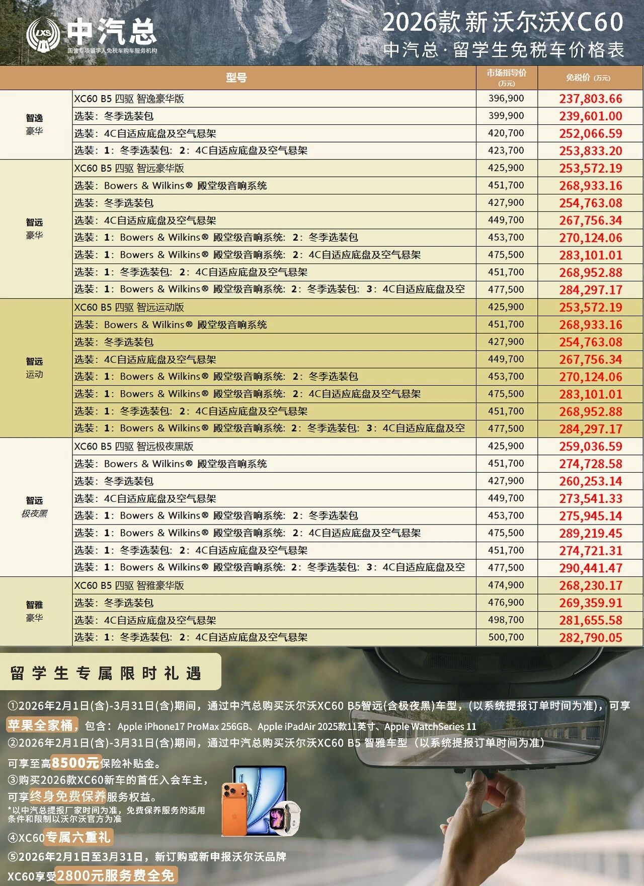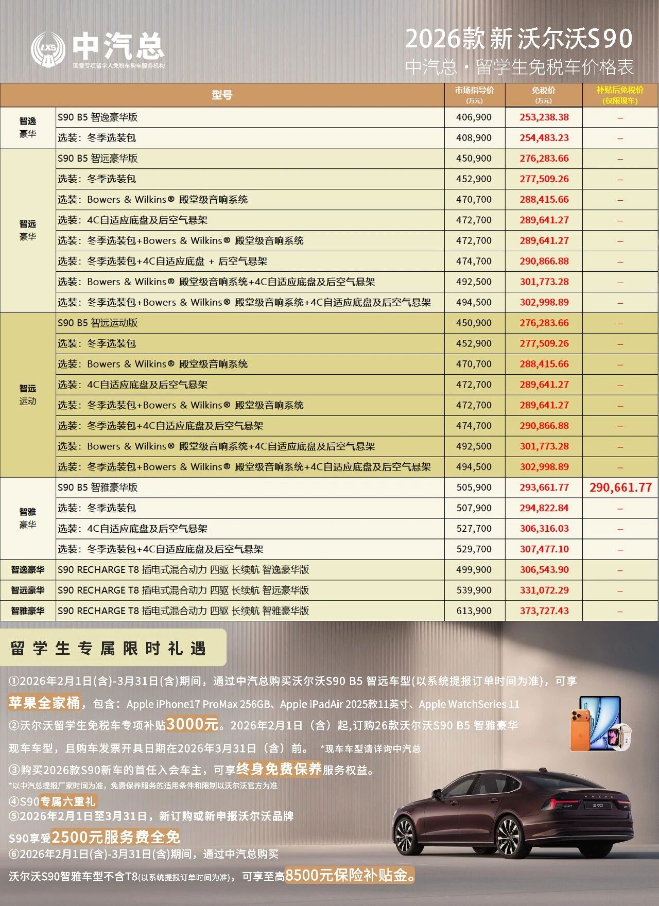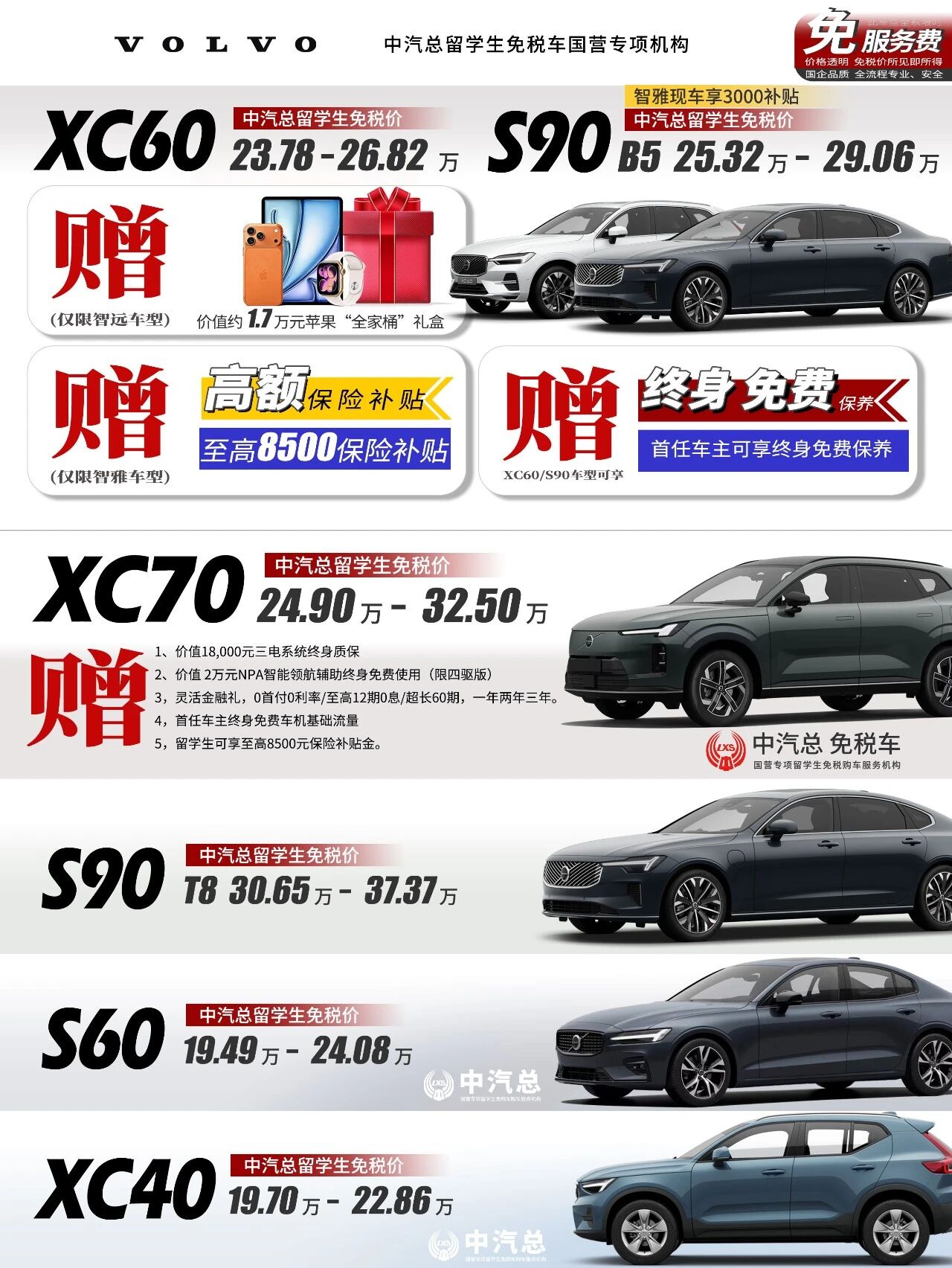 送苹果全家桶?高额补贴 / 终身保养 / 免服务费等福利 沃尔沃留学生免税车价格更新